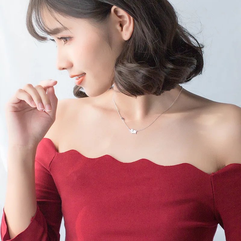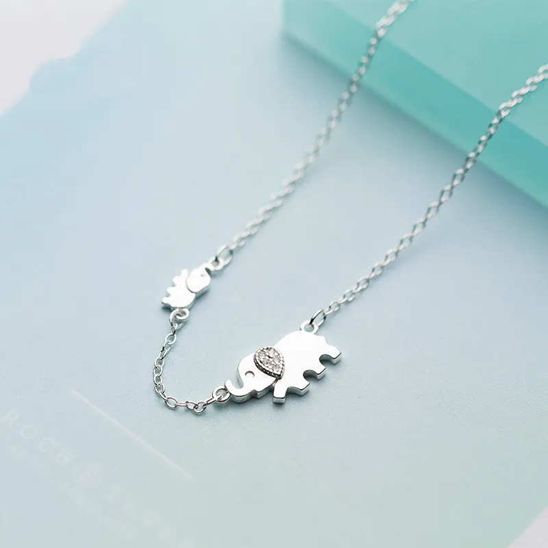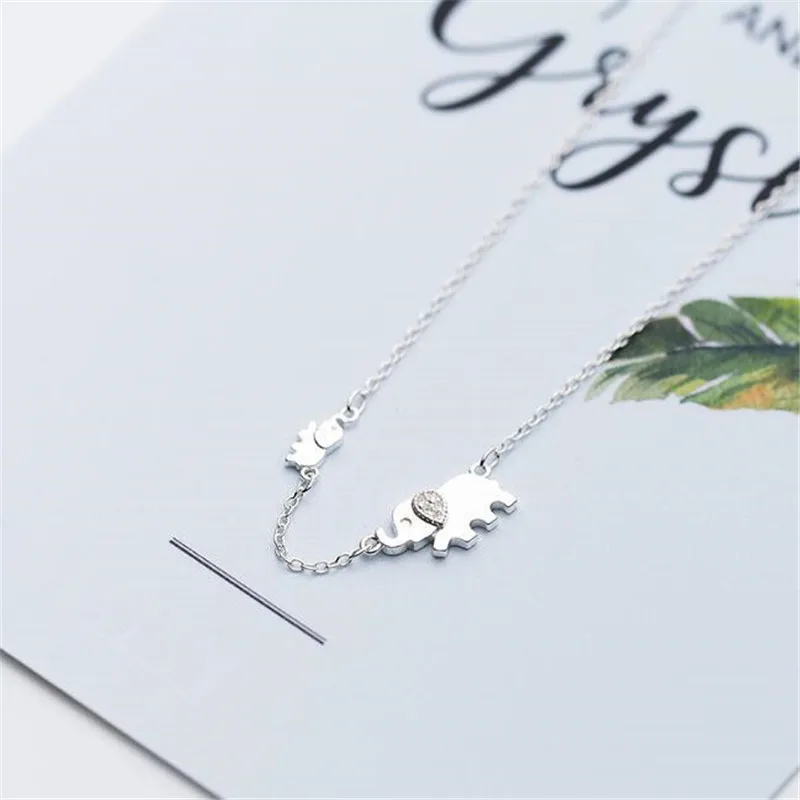 Cute Animals 925 Sterling Silver Double Rhinestone Elephant Necklaces For Women Lady Student Jewelry