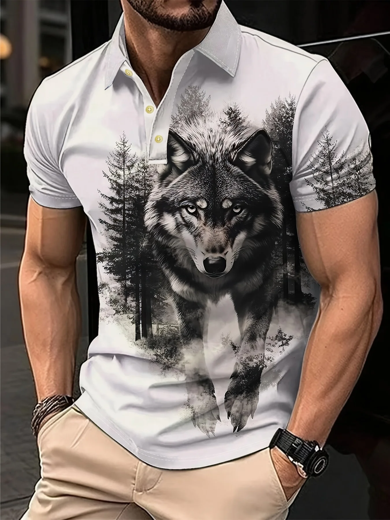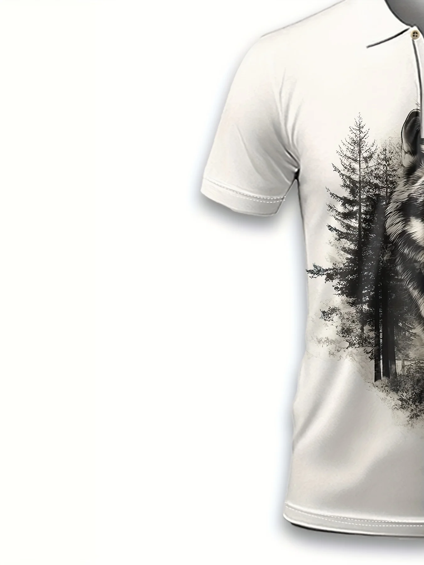 Men's Wolf and Forest Printed Shirt - Breathable Short Sleeve Casual Top with Monochrome Animal Pattern